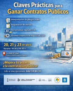El curso “Claves prácticas para ganar contratos públicos” impulsa el acceso de pymes y autónomos a la contratación pública El curso gratuito “Claves Prácticas para ganar contratos públicos” se celebrará en abril en la Vall d’Uixó con un enfoque aplicado e innovador basado en herramientas digitales e inteligencia artificial Leer más…AQUÍ |