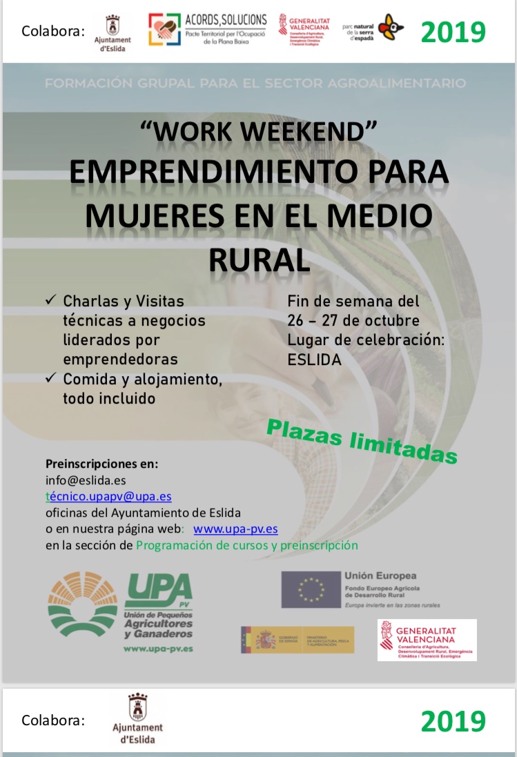 El Pacto Territorial por el Empleo de la Plana Baixa impulsará el emprendimiento femenino a través del Work Weekend de Mujeres Rurales, evento gratuito que se celebrará este fin de semana en Eslida con el objetivo de ayudar a las mujeres del ámbito rural a poner en marcha sus proyectos.