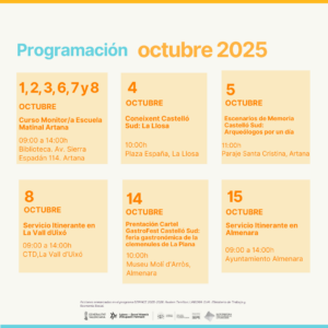Octubre arriba a la Plana Baixa carregat d’accions formatives i de promoció turística. En la programació d’octubre s’oferix el servici itinerant d’orientació laboral, a més de proposar activitats enfocades al suport en l’orientació laboral,realització d’accions formatives (cursos, jornades,…) i promoció del valor turístic i històric dels municipis amb diverses activitats. Llegir més...ACÍ |
