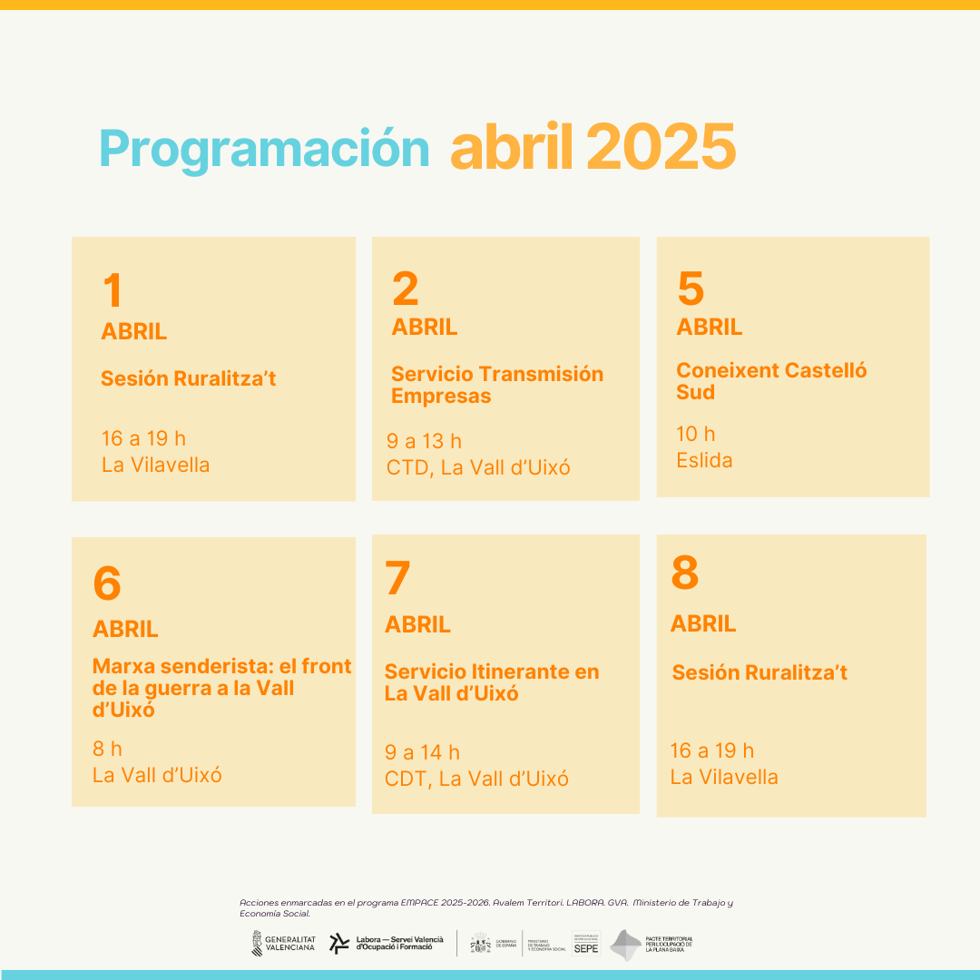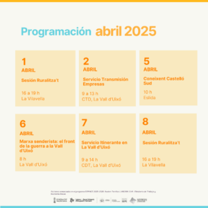 En la programació d’abril s’oferix el servei itinerant d’orientació laboral, a més de proposar formacions en competències digitals i el servei d’atenció a empreses. També hi ha programades diverses activitats turístiques i es contínua a mb les sessions del programa RURALITZA’T.