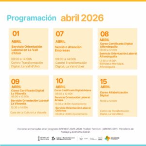 Tres claus per a l’ocupació a l’abril: certificat digital,accés a contractes públics i augment de vendes Abril reforça l’ocupabilitat amb formació en certificat digital, claus per a accedir a contractes públics, estratègies de vendes 360º i jornades d’orientació en instituts, impulsant les competències digitals, l’accés al mercat laboral i el creixement d’empreses i persones emprenedores a través d’accions pràctiques en el territori. Llegir més…ACÍ |